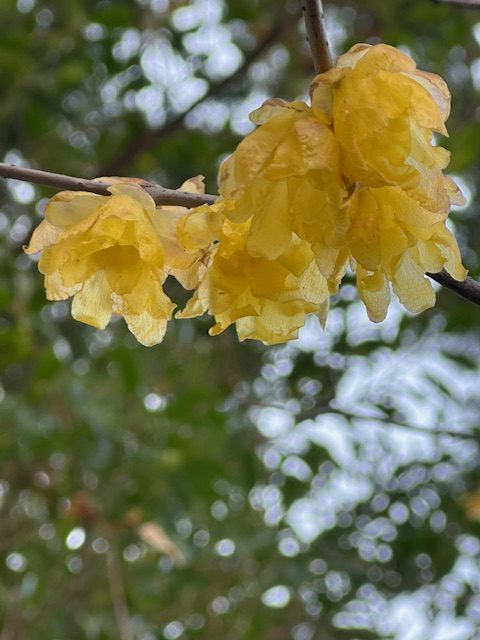 階段で甘い香りがしてキョロキョロしてみたらロウバイが咲いていました。